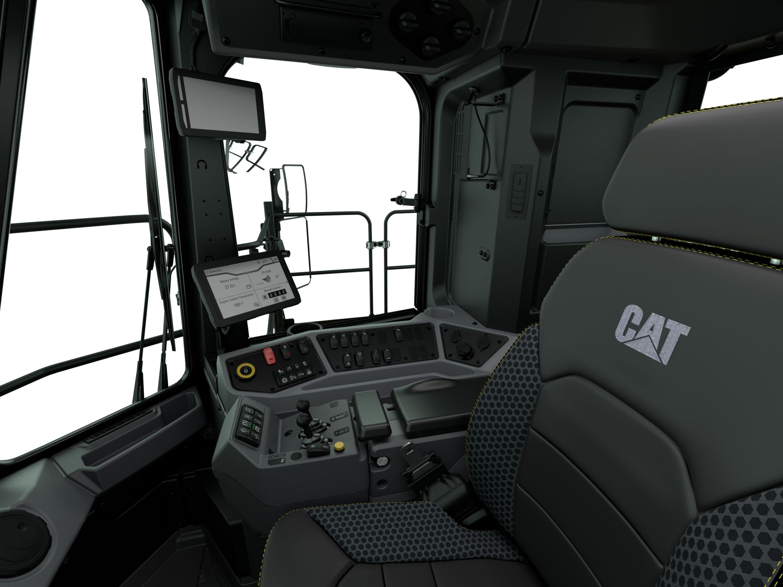 - Pressurized cab featuring Next Gen Seat with 9-inch travel, active cooling and heating, adjustable lumbar support, seat cushion tilt adjustment, and air-adjustable bolsters on the seat and backrest.